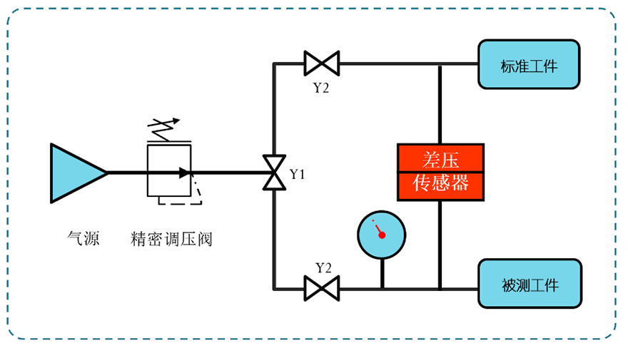 基本原理:打开Y1和Y2,将一定压力的气体,同时冲入相等容积的标准工件和被测工件内,关闭Y2,经过平衡稳定后,测量标准工件与被测工件的压力差值,该差值即是实际泄漏值,因取得压力差值的感应器是独立的,所以该测试方法不受充气压力的影响和限制,并且精度非常高。
